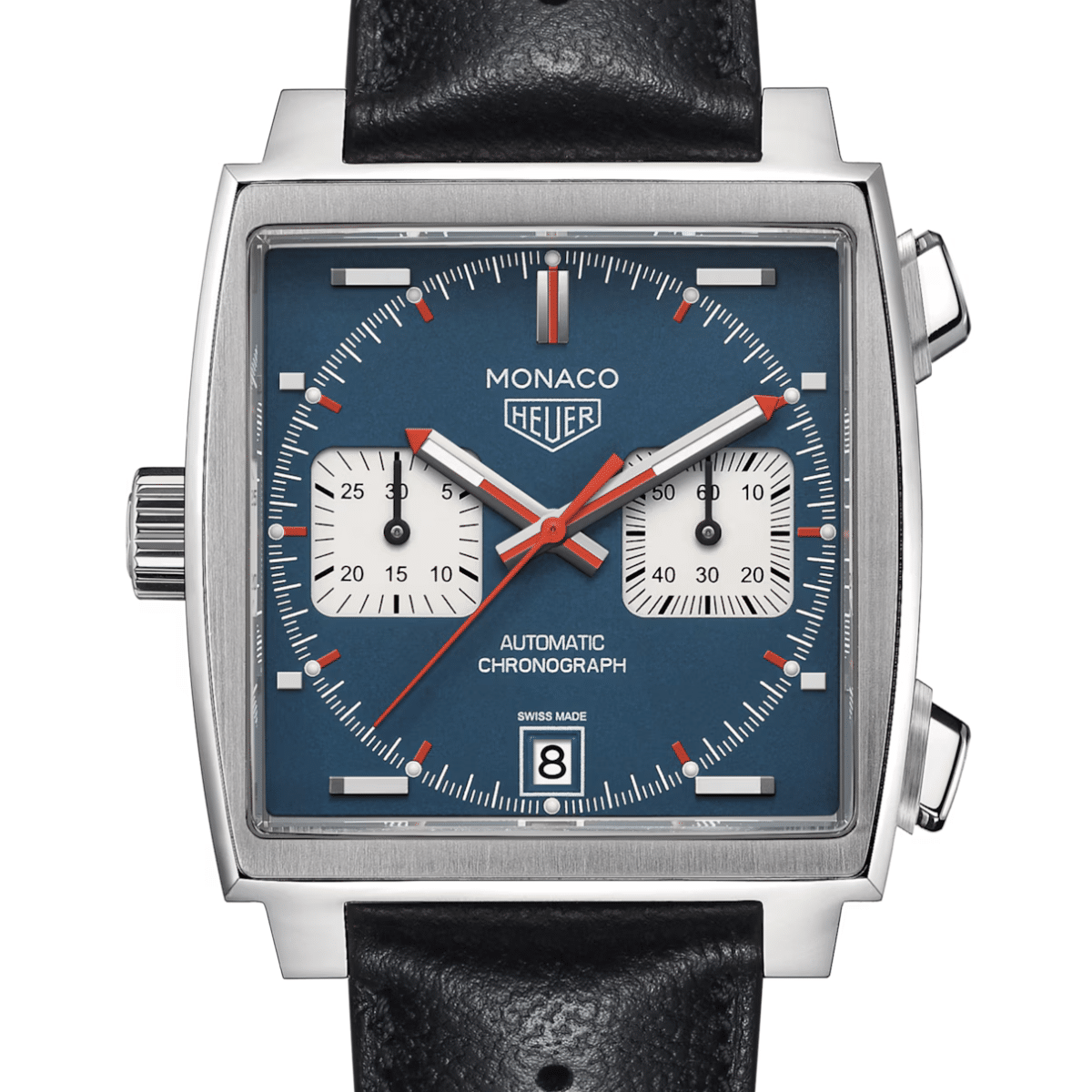 De TAG Heuer Monaco Calibre 11 is een tijdloze rebel die grenzen doorbreekt met zijn iconische ontwerp. De blauwe wijzerplaat met horizontale stalen indexen wordt geaccentueerd door zilveren subdials voor chronograafminuten en -uren, een datumvenster op 6 uur en een opvallende rode chronograafwijzer die een onmiskenbare racingsignatuur toevoegt. Het sportieve karakter wordt verder versterkt door de zwarte kalfslederen band met een speciale afwerking die doet denken aan het asfalt van het racecircuit. Voor het eerst gedragen door Steve McQueen in de film Le Mans (1969), belichaamt de Monaco nog altijd dezelfde revolutionaire geest en is het een icoon van stijl, innovatie en de ultieme ‘King of Cool’.