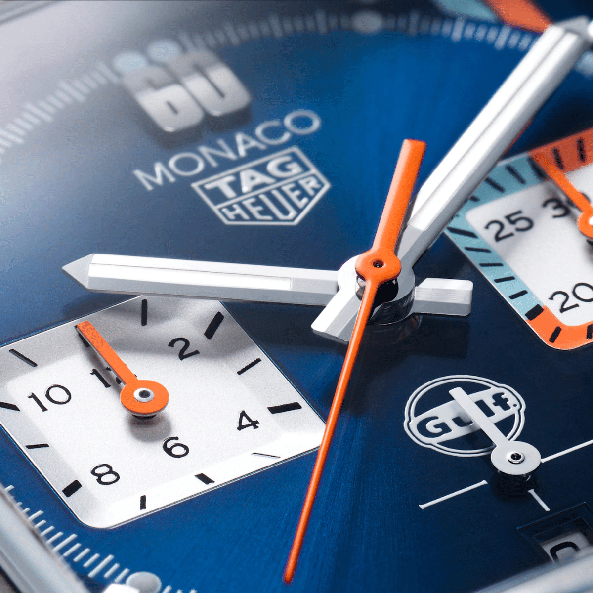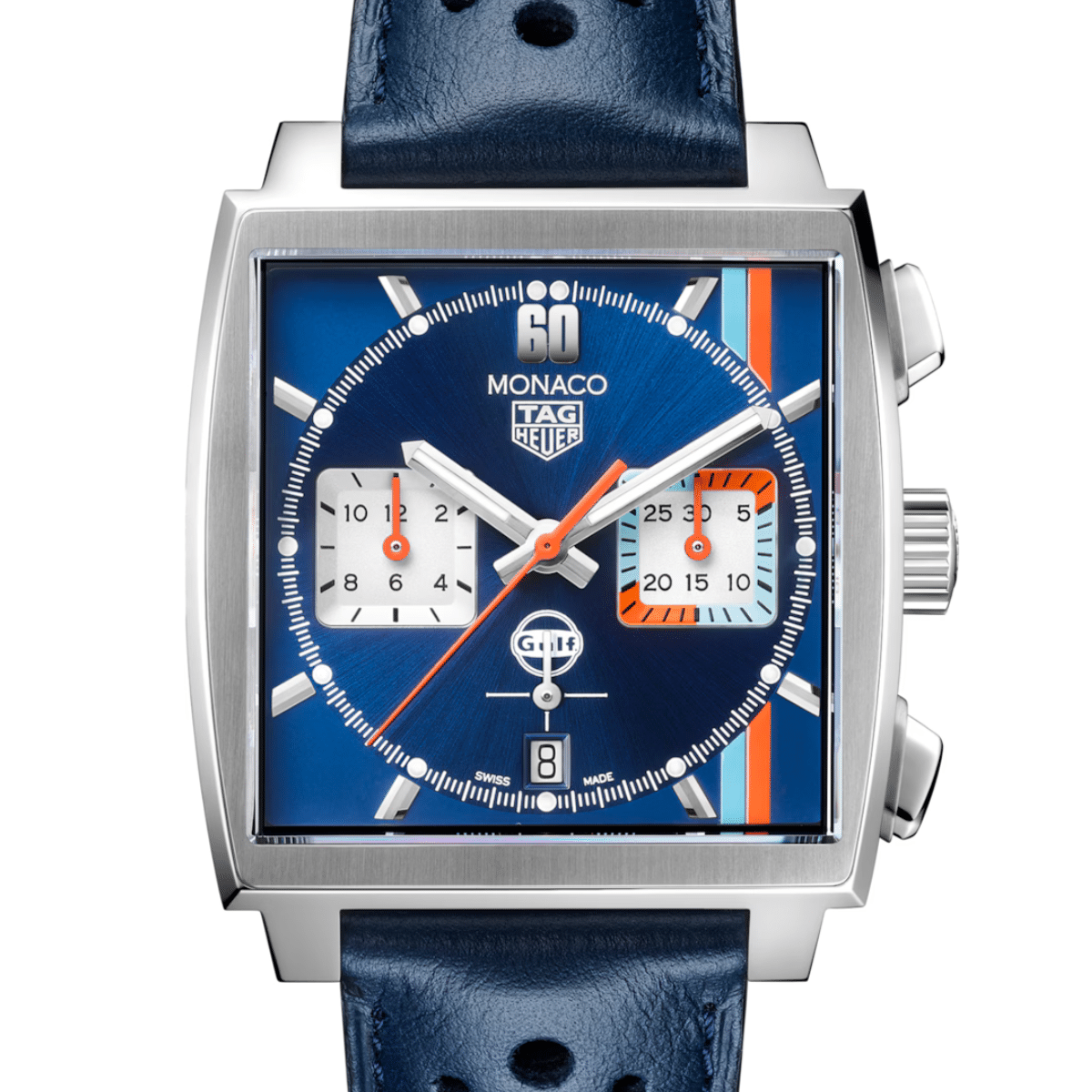 Als ultiem eerbetoon aan de iconische samenwerking wordt dit model geleverd in speciaal ontworpen verpakking, inclusief een blauw lederen reisetui met oranje stiksels; een subtiele knipoog naar de kenmerkende Gulf-kleuren. Een waar verzamelobject voor liefhebbers van horlogegeschiedenis en autosport.