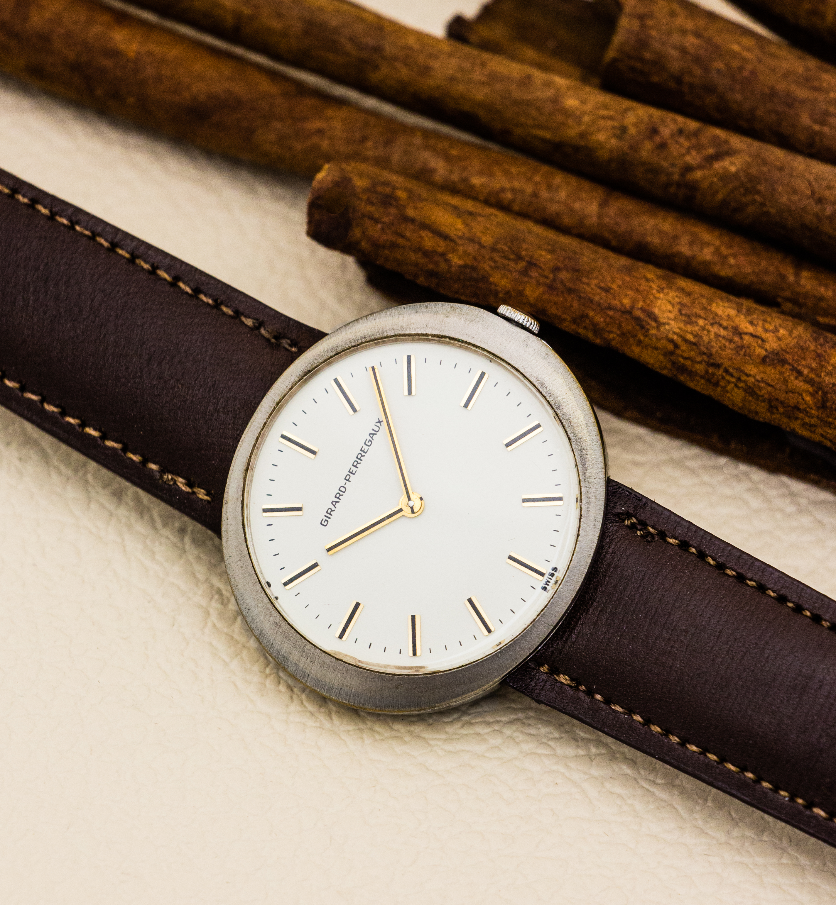 Deze vintage Girard Perregaux Oval dateert uit de jaren 70. Dit is een periode waarin veel met vormen werd geëxperimenteerd. Deze zeitgeist komt perfect naar voren in dit horloge. Het is een ovaal horloge over de breedte met een ronde wijzerplaat. Het horloge is in goede conditie. Let u alstublieft op dat het horloge op de achter deksel enkele metaal pitjes heeft. Zie bijgaande foto’s.