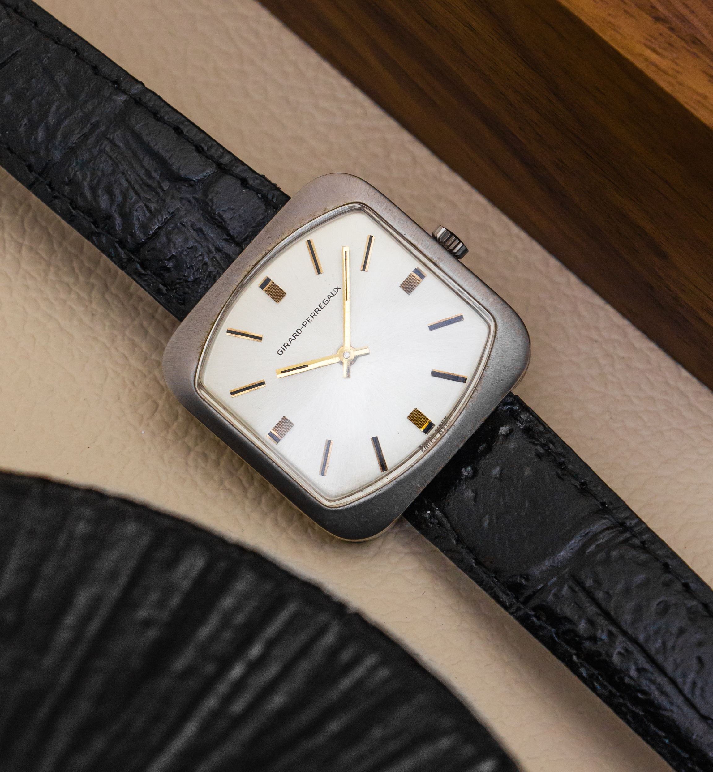 Het specifieke horloge dat wij u tonen dateert uit de jaren 70. Dit is een periode waarin veel met vormen werd geëxperimenteerd. Deze zeitgeist komt perfect naar voren in dit horloge. Het is een vierkant horloge met afgeronde hoeken, met een tonneau vormig glas waarbij de indexen in een ronde vorm zijn gezet. Het kleurcontrast van de indexen met de wijzerplaat geeft het horloge een dynamische uitstraling.